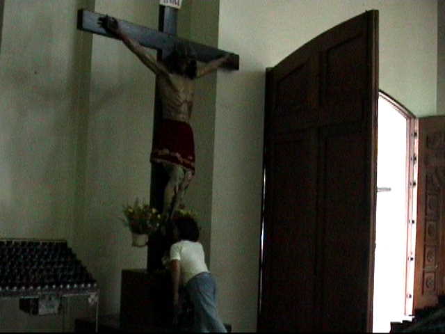 この女性悲壮な顔をして十字架にすがっておられました